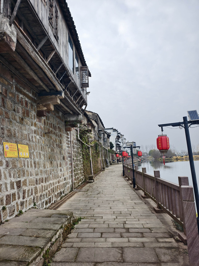 屯溪西郊两公里,横江岸边隆阜古村的隆阜街,是一条远近闻名的商埠古街。当年的隆阜古街商业繁荣。从隆阜东边村头开始,依次分为隆阜下街、隆阜中街、隆阜下街,沿街店铺一家连一家。上、下街,各有巷弄石阶道往横江船运码头,至今还留有五处横江码头遗迹,在上街船运码头,坚实的麻石台阶仍可让人想见当年的繁忙景象。而中街的码头通道台阶上,则还保留了当年过街楼的痕迹,由于年复一年木质独轮车碾压而留下的街面条麻石深深的车辙之痕,记载着古村厚重的历史。现今的隆阜古街少了往日的繁闹,多了几分闲静。