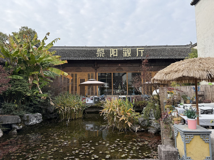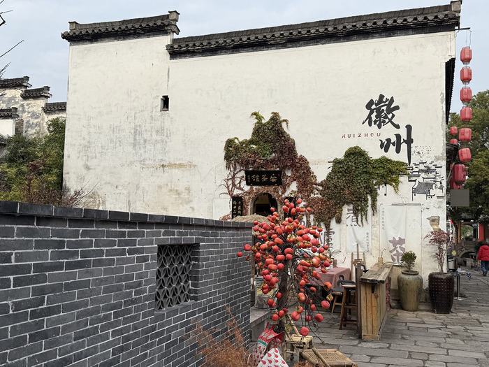 前景的青灰砖墙带有徽派镂空砖雕纹样,是传统工艺的延续;而墙面旁布置的仿真红柿树、休闲茶座,以及现代风格的装饰灯笼,则融入了黎阳老街改造后新增的休闲体验元素,体现出老街“老建筑+新业态”的特色,结合茶馆类业态的陈设,营造出黎阳老街兼具徽州市井烟火与现代慢生活的休闲氛围,契合其“集非遗、餐饮、休闲于一体的文化旅游街区”定位。