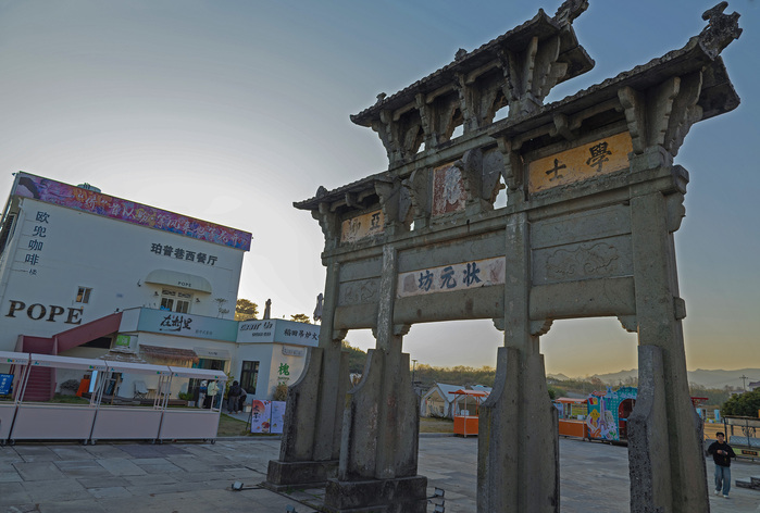 古朴的“状元坊”牌坊矗立在广场上,坊上刻有“学士”等字样,尽显历史韵味。牌坊一侧是现代风格的建筑,其上“欧兜咖啡”“珀普巷西餐厅”等招牌清晰可见,新旧建筑在此交融,展现出独特的氛围。